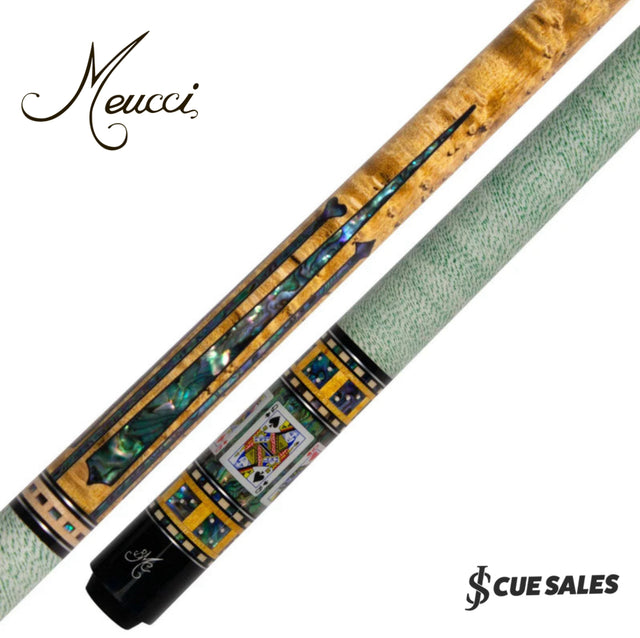 Experience a professional feel with the BMC Casino 6. Its antique-stained maple forearm has 4 Paua Shell points framed in black, with four 5-inch lines of Paua Shell between the points, each ending with one of the 4 suites. The urethane-coated natural Irish linen wrap and distinctive buttsleeve design featuring a 4 card royal flush in spades over genuine Paua Shell, trimmed with black on each side, make this cue a unique addition to any game room.